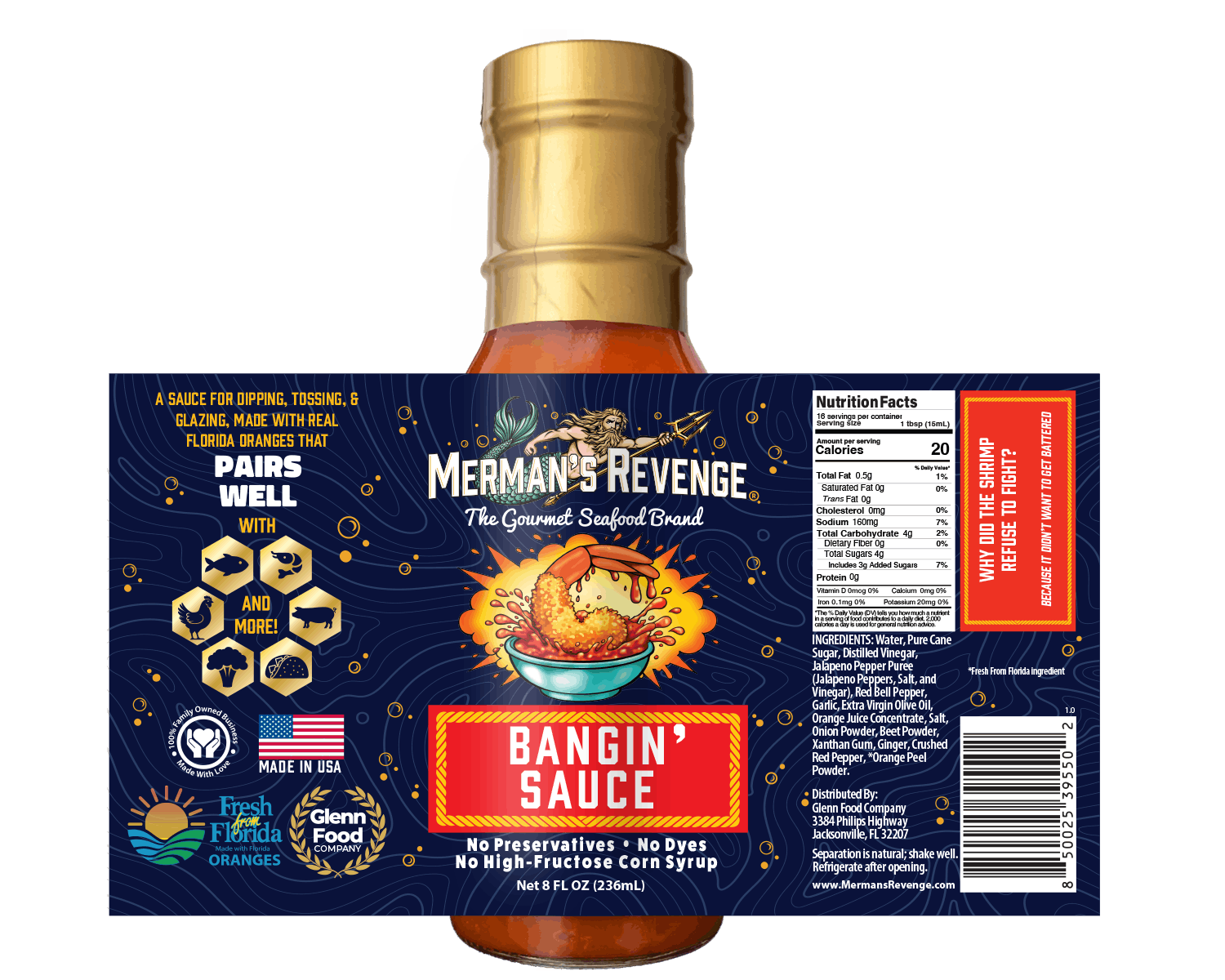 Merman’s Revenge Bangin’ Sauce is our NEW and exciting twist on your favorite restaurant-style “Bang Bang” sauce. It’s sweet, savory with a very mild heat, perfect for the whole family to enjoy! This creamy sweet and savory sauce is delicious with shrimp, fish, chicken and more!