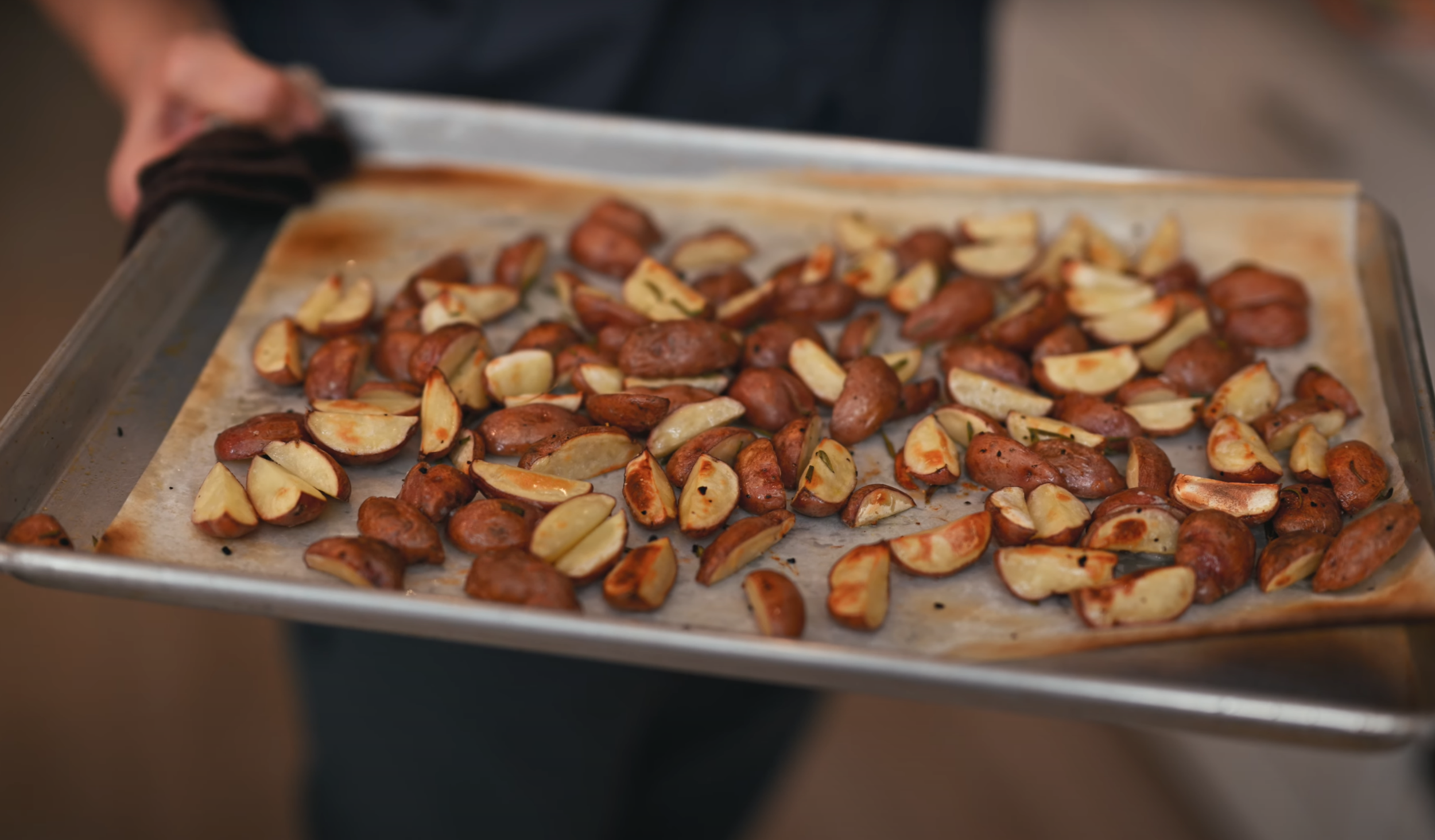 Toss the quartered red potatoes with olive oil, rosemary, salt, pepper, and minced garlic.