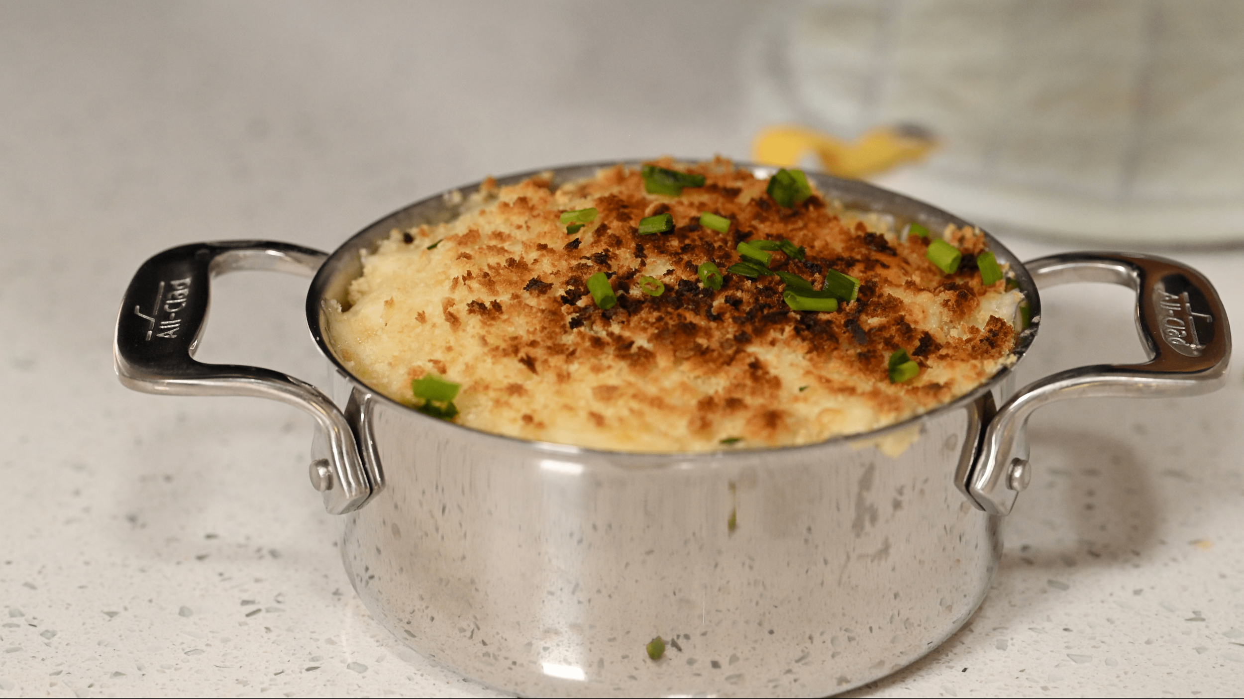In an oven preheated to 350 °F (177 °C), bake your mashed potato bowl until it’s golden and bubbly (about 10 minutes).