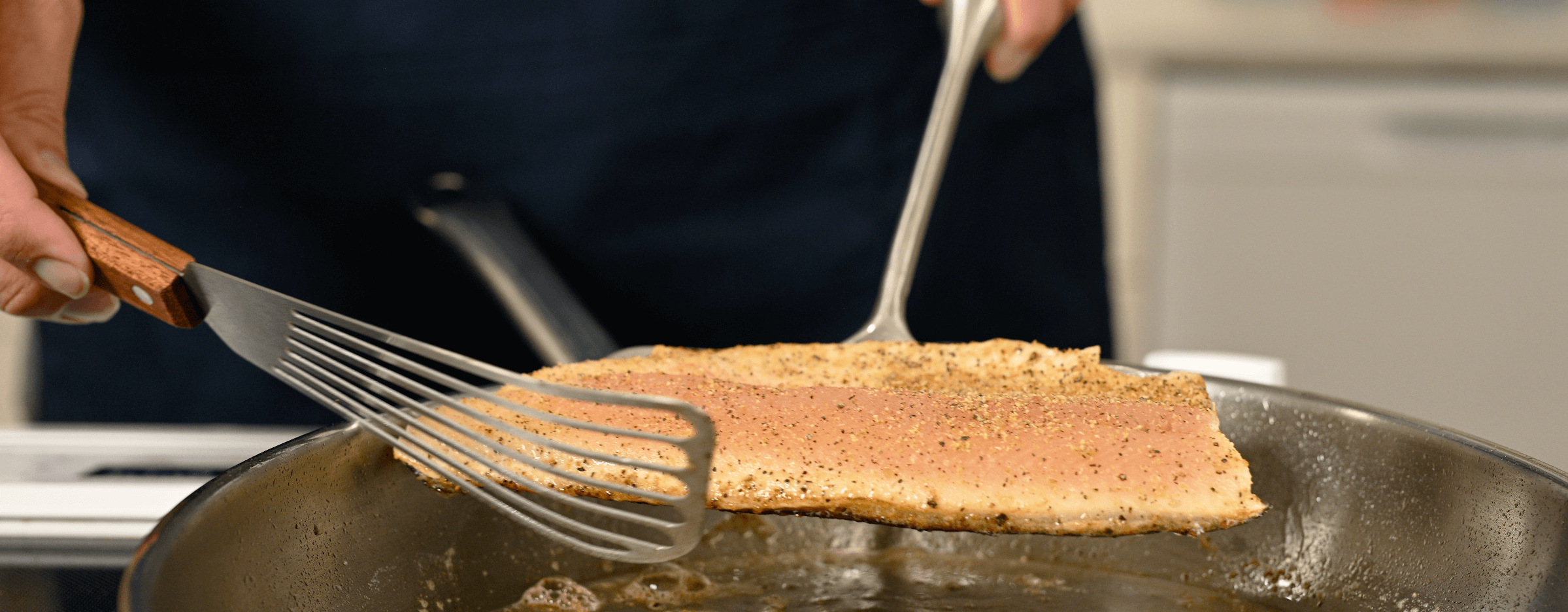 If you're flipping the trout, a thin, flexible spatula makes it much easier to slide under the skin without tearing it. It’s especially useful for delicate fish like trout.