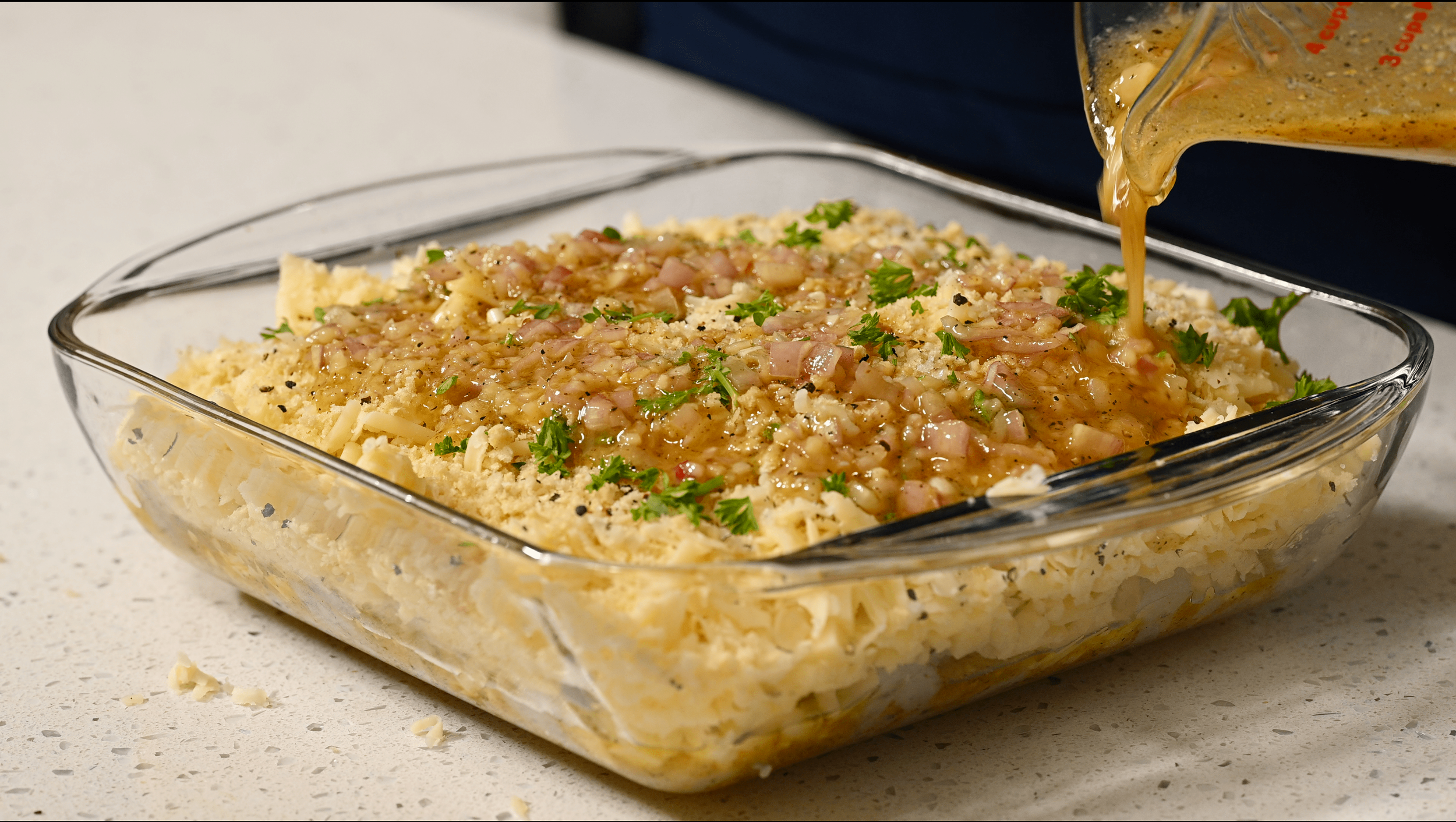 For the next layer, add in the shrimp, cheese, panko, salt and pepper to taste, and parsley.