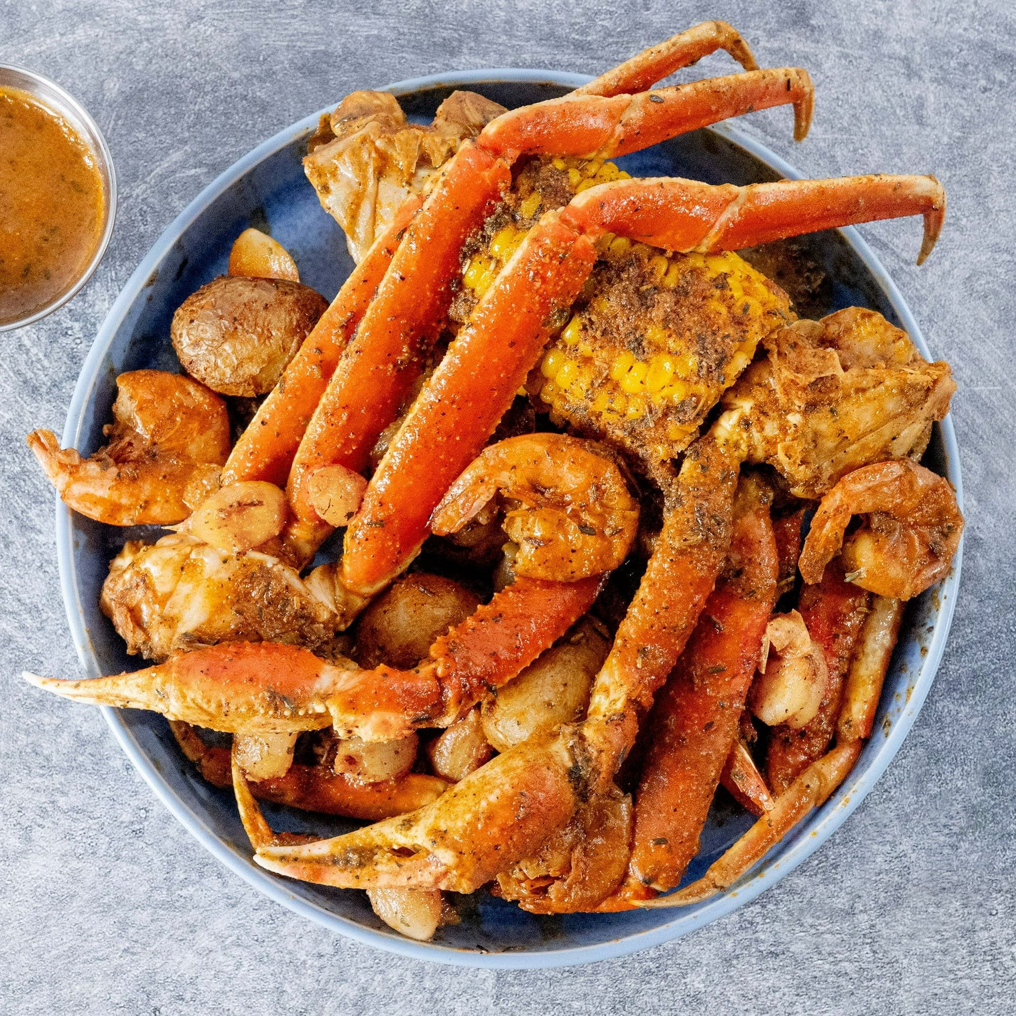 Snow Crab, Shrimp, Corn on the Cob, Potatoes, Pearl Onions, and Merman’s Revenge Seasoning Packet
