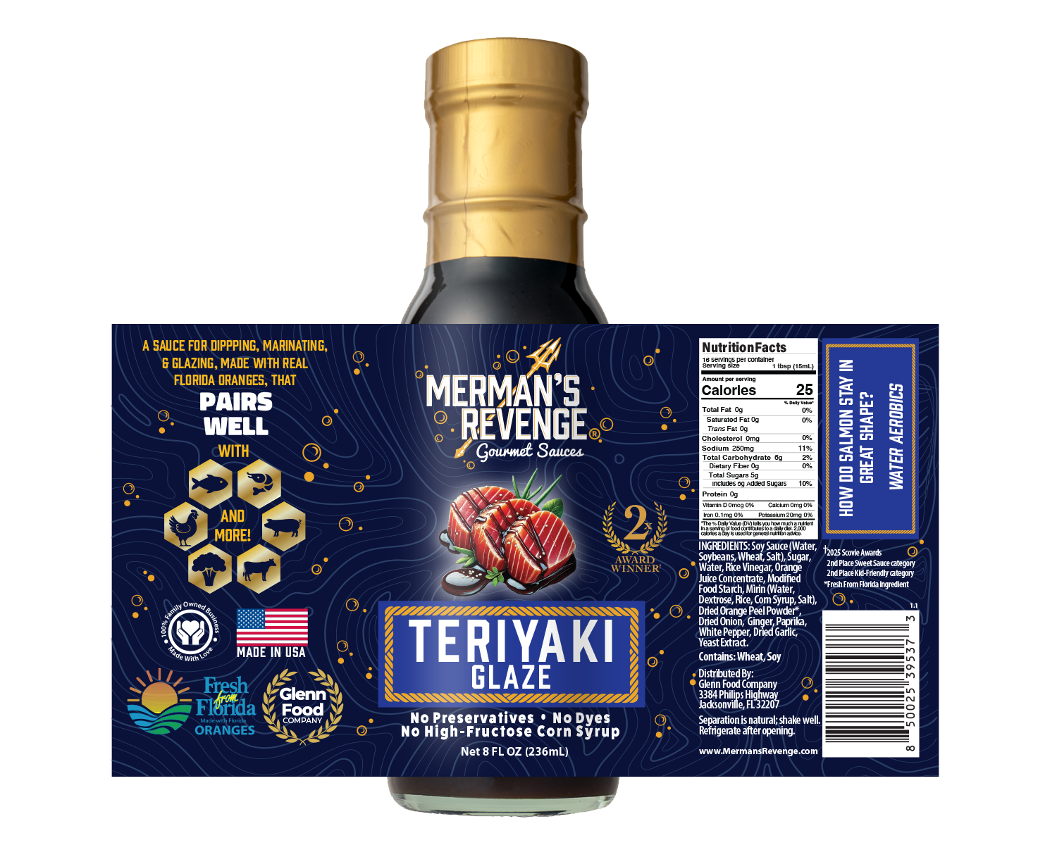 Merman’s Revenge Teriyaki Glaze is a smooth, citrus-infused seafood sauce, perfect for enhancing the flavors of salmon, sushi, and more. Made with real Florida oranges, this sauce offers a delicate sweetness without the heat, and its lighter consistency sets it apart from traditional teriyaki glazes. Ideal for drizzling or dipping, it brings a refreshing twist to your favorite dishes.